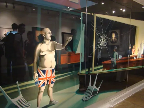 Haddock at the "Crude Oils" exhibition pointing at him self.